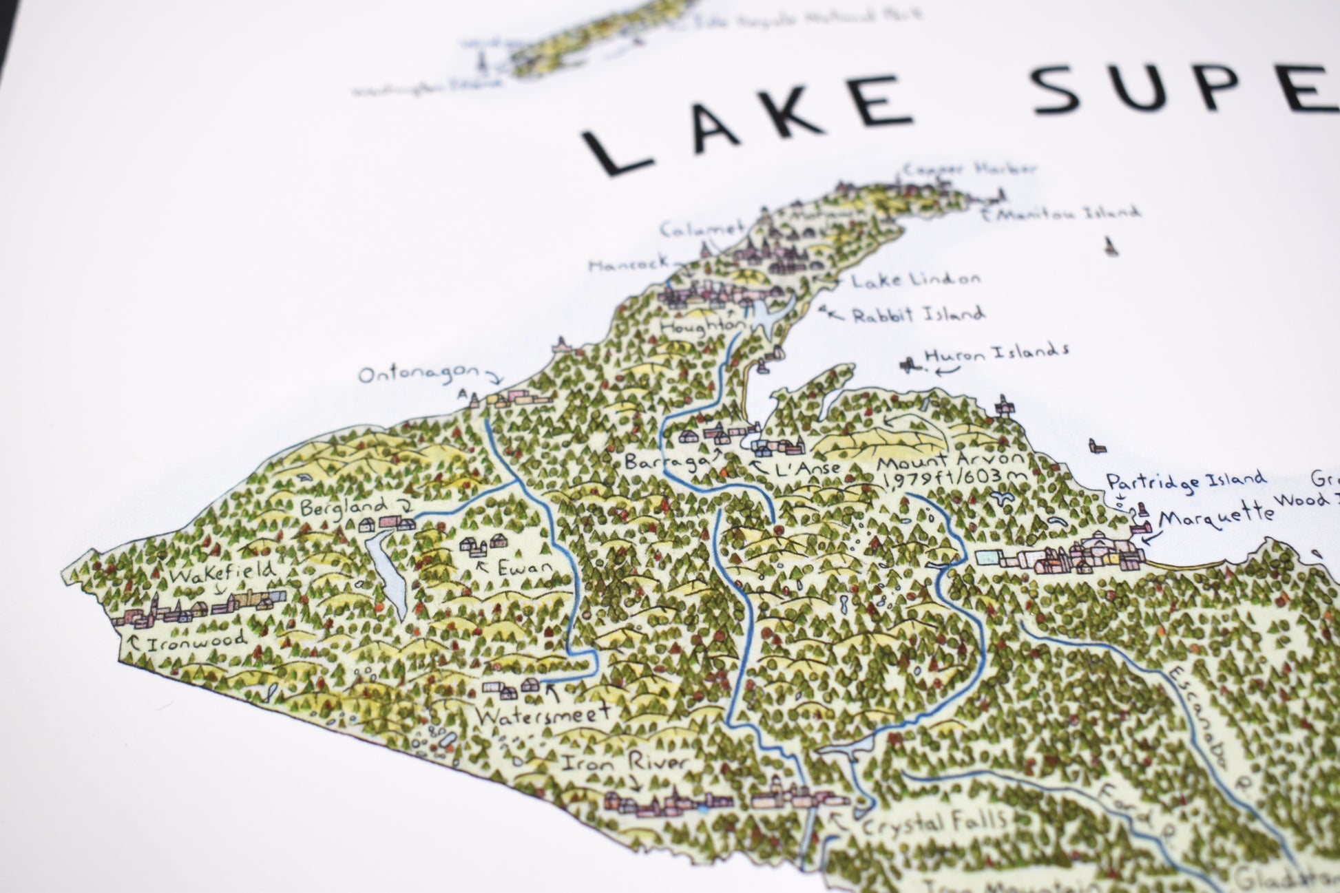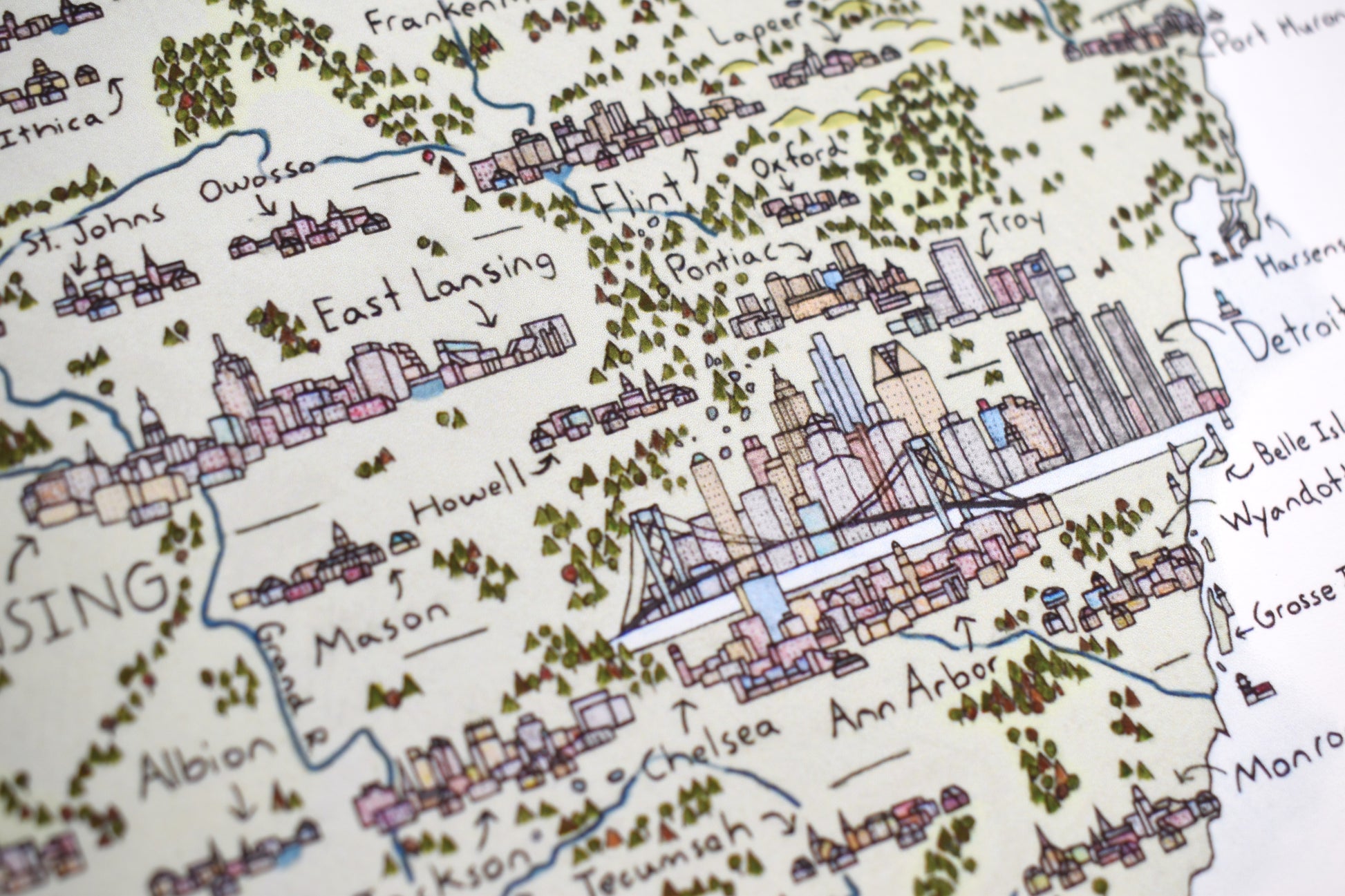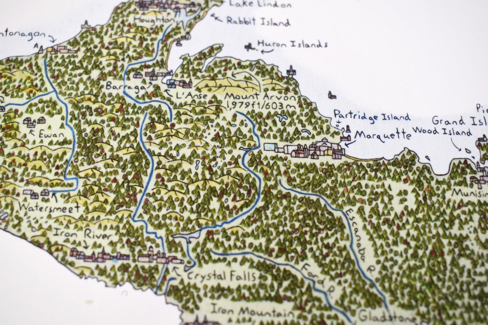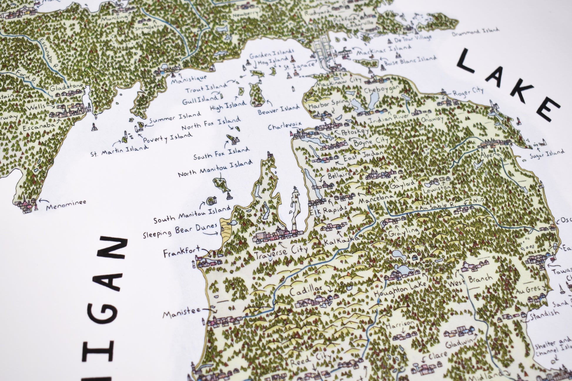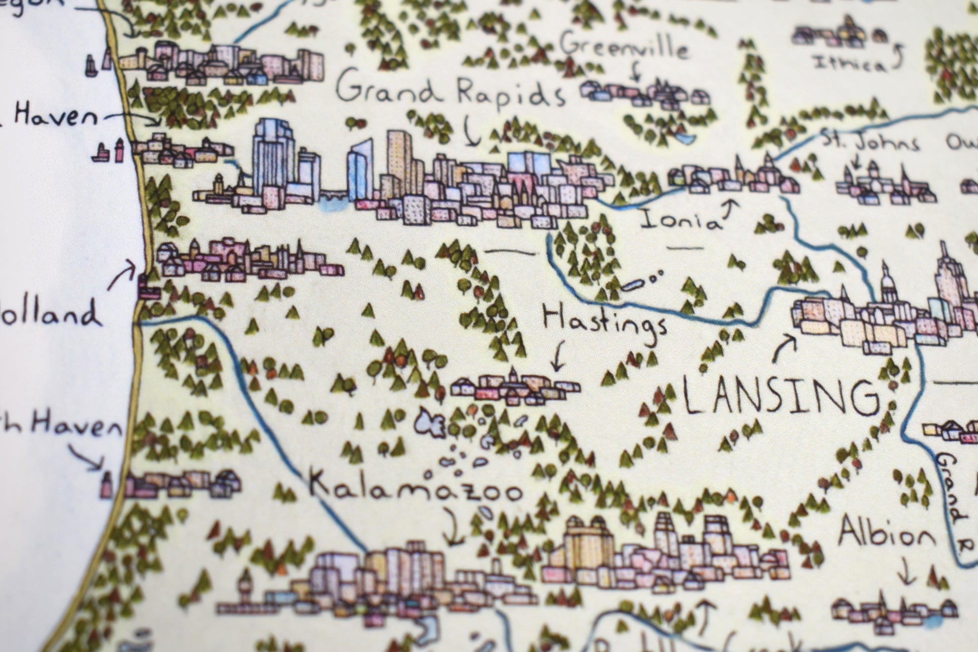 Hand drawn map of the State of Michigan, completed over the course of 10 months. Including over 130 cities as well as all 129 lighthouses scattered across the coast. Detailed terrain including forests, rivers and hills.